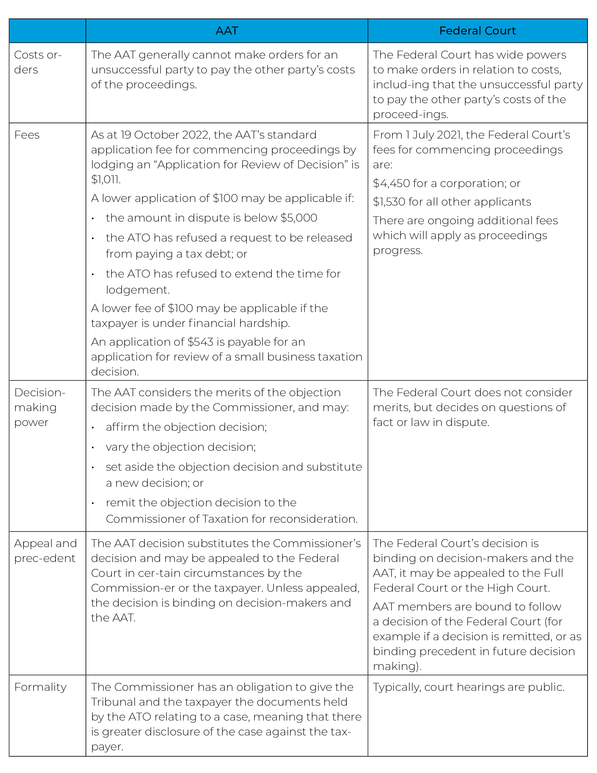 Taxpayers may be able to appeal objection decisions in the AAT or the Federal Court, depending on the issues in dispute. Some strategic factors which the taxpayer might consider in relation to which forum to choose are outlined below: