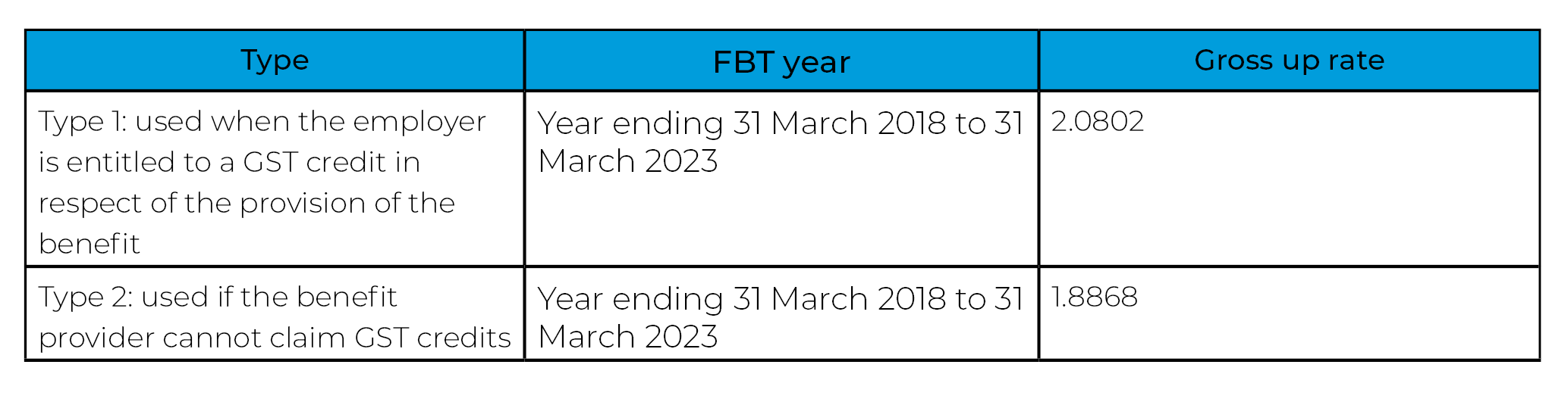 The FBT rate for the years ending 31 March 2018 to 31 March 2023 is 47 per cent, calculated as follows: